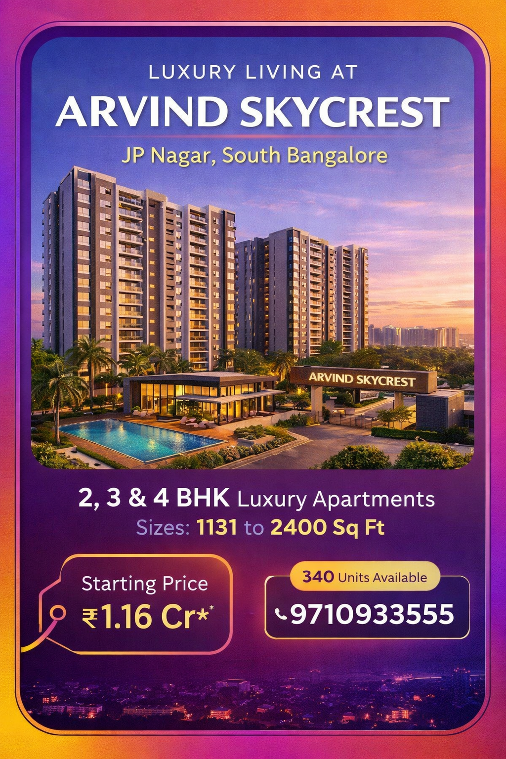 Bannerghatta Road has emerged as one of the most promising real estate corridors in Bangalore. The combination of strategic location, robust infrastructure development, and lifestyle-driven residential projects makes Arvind Skycrest an attractive choice for investors. Whether you are buying a home for personal use or as a long-term investment, the project promises excellent appreciation potential in the coming years.
